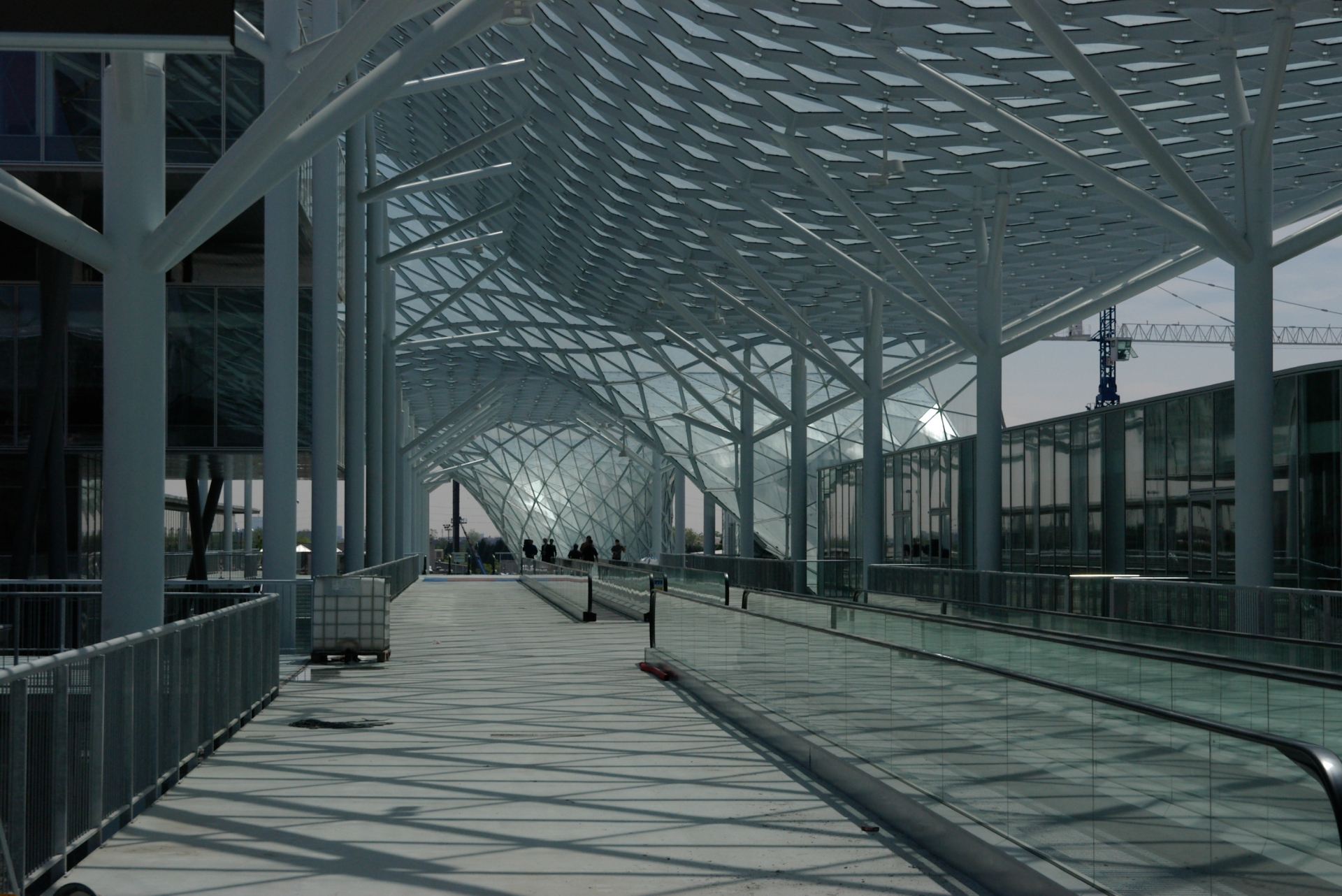 La copertura che sormonta tale percorso è una “vela” di vetro larga oltre 30m sorretta da pilastri circolari in acciaio e formata da travi reticolari in carpenteria metallica verniciata.