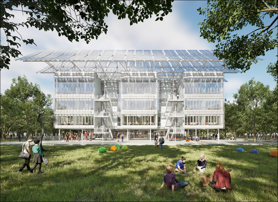 Il nuovo insediamento è composto da una serie di edifici modulari e simmetrici, disposti sotto una grande copertura fotovoltaica che non solo garantirà l’approvvigionamento di energia rinnovabile per l’intero complesso, ma fungerà anche da elemento di connessione e unificazione visiva del campus.